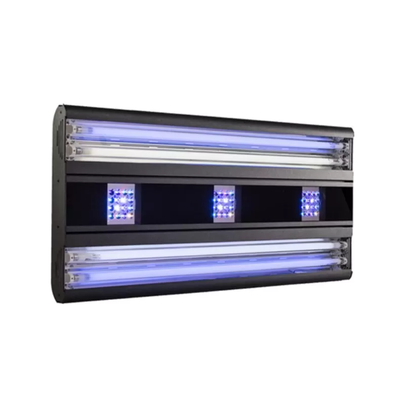 Der Giesemann Gemini Hybrid bietet den idealen Einstieg in die Hybridtechnik. Mit der eingebauten Bluetooth-Lichtsteuerung lassen sich 3 LED-Kanäle stufenlos dimmen und programmieren, außerdem lassen sich die beiden T-5-Kanäle – mit insgesamt vier T-5-Lampen – zur gewünschten Zeit ein- und ausschalten .