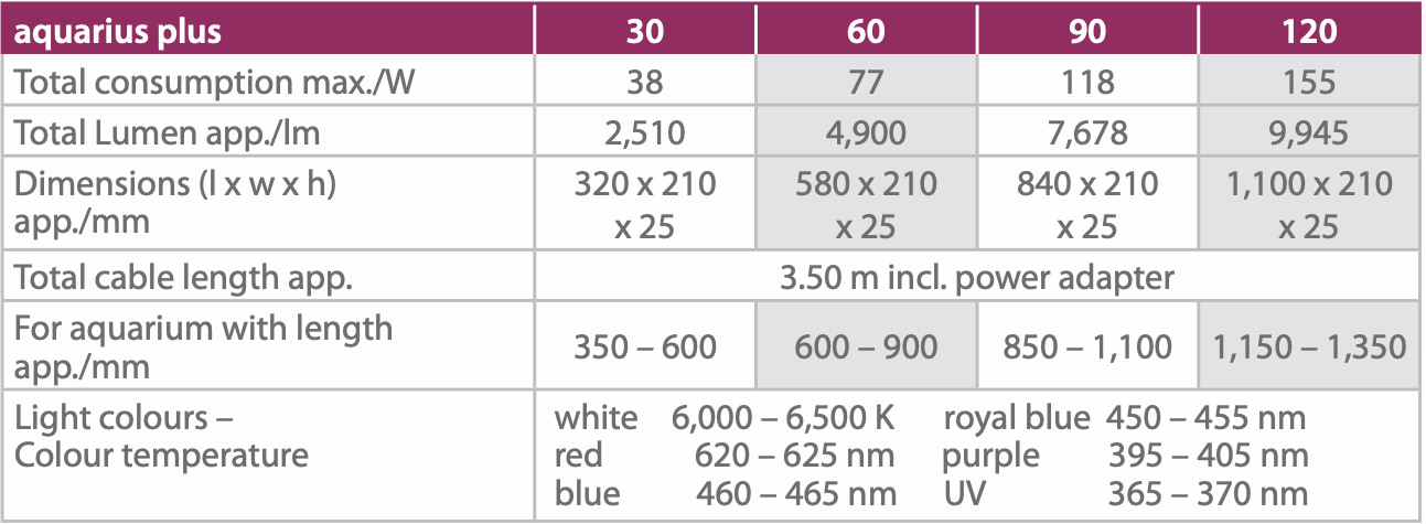Lichtfarben und Farbtemperaturen Aqua Medic aquarius plus: