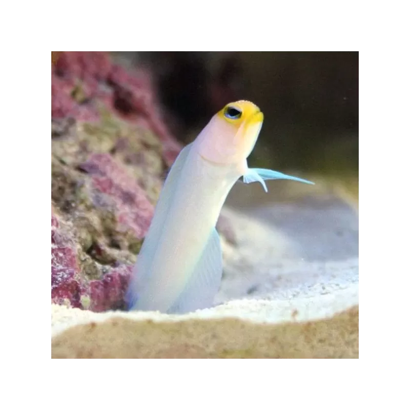 Ein lustiger und kleiner Fisch, der sich sehr gut für Nano-Aquarien eignet, ist der Gelbkopf-Kieferfisch. Diese kleinen Backenzähne sind recht scheu und brauchen ausreichend Versteckmöglichkeiten zwischen den Steinen, um sich zu verstecken, graben sie Löcher unter den Steinen, um sich zu verstecken.