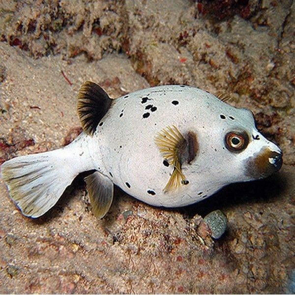 - Schwarze Flecken: Wie der Name schon sagt, ist dieser Kugelfisch mit zahlreichen schwarzen Flecken übersät.