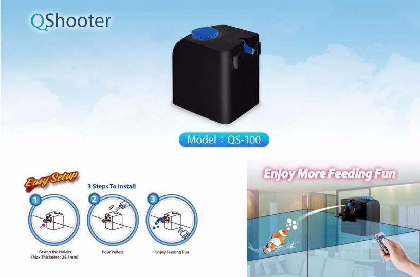 Qshooter ist eine Pelletpistole, die lustig ist und Spaß macht. Es wird per Fernbedienung bedient und ermöglicht es, die Fische auf ungewöhnliche Weise zu füttern, indem dieses Pellet in das Aquarium geschossen wird.