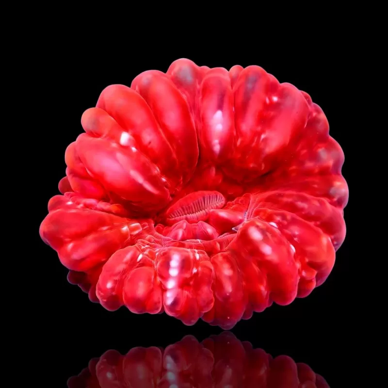 Die Cynarina Ultra Red Button Coral ist eine Steinkoralle mit großen Polypen (LPS) und wird oft als Katzenaugen-, Zahn-, Donut-, Tränenauge- oder Fleischkoralle bezeichnet. Der Gattungsname Cynarina leitet sich von den griechischen Wörtern „kinara“ (Artischocke) und „ina“ (ähnlich) ab und wie der Name schon sagt, sieht sie tatsächlich wie eine Artischocke aus. Die Cynarina-Knopfkoralle ist eine runde Solitärkoralle, eine der größten unipolaren Korallen, die heute in der Natur vorkommen, und in vielen verschiedenen Farbformen erhältlich, von Pastell über klar und durchscheinend bis hin zu stumpferen Variationen. Manchmal wird es mit seinem nahen Verwandten Scolymia verwechselt.