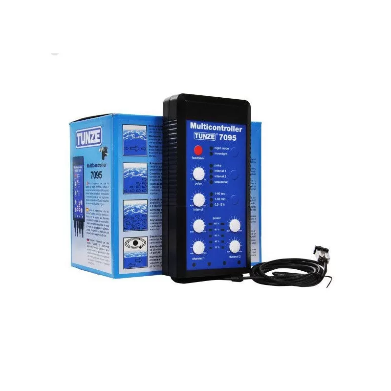 Der Tunze Multicontroller 7095 ist ein digitales Steuergerät für alle Turbelle-Pumpen. Das Gerät verfügt über einen Elektromotor und simuliert die unterschiedlichen Strömungsverhältnisse in einem Aquarium.