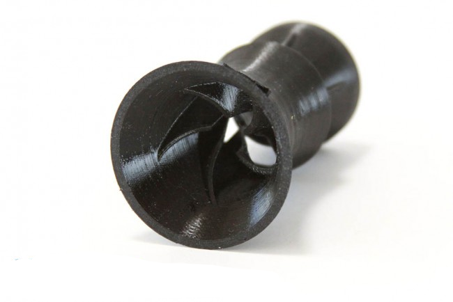 Die 5 inneren Rippen bilden eine Reihe spiralförmiger Kanäle. Wenn das Wasser durch die Düse fließt, ziehen die Kanäle den Wasserstrom in die eine oder andere Richtung. Die geringe Interferenz an der Basis des Eduktors bewirkt, dass der Strom beim Austritt aus der Düse willkürlich die Richtung ändert.
