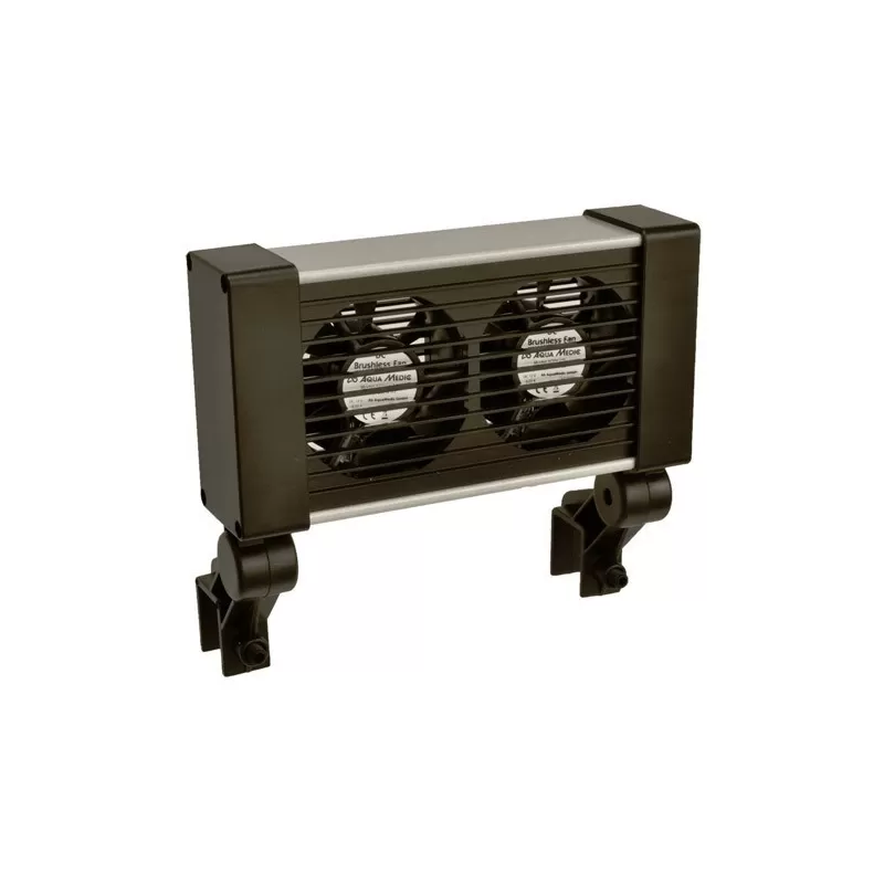 Leistungsstarker Lüfter im wärmeableitenden Aluminium-Kunststoffgehäuse zur Kühlung des Aquarienwassers durch Verdunstungskühlung.