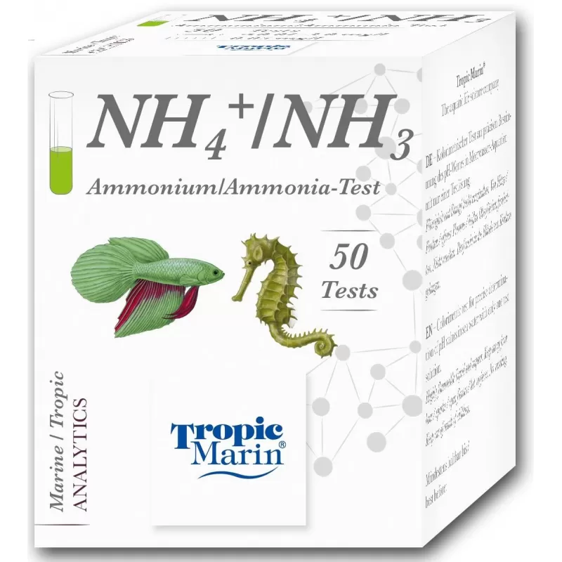 Mit dem Tropic Marin® Ammonium/Ammonia-Test kann die Gesamt-Ammonium/Ammoniak-Konzentration anhand einer fein abgestimmten Farbkarte mit einem Konzentrationsbereich von 0,02 - 3 mg/l bestimmt werden. Entscheidend ist, dass die sich aus der Ammoniak/Ammonium-Konzentration ergebende Gesamt-Ammoniak-Konzentration von der Temperatur und dem pH-Wert abhängt.