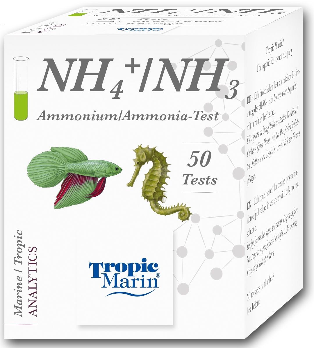 Mit dem Tropic Marin ® Ammonium/Ammonia-Test kann die Gesamt-Ammonium/Ammoniak-Konzentration anhand einer fein abgestimmten Farbkarte mit einem Konzentrationsbereich von 0,02 - 3 mg/l bestimmt werden. Für Süß- und Meerwasser geeignet