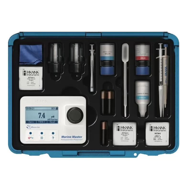Jedes HI97105 Photometer kommt mit viel Zubehör, bekannt von den Hanna Checkers. Ein spezielles Marine Master Photometer Kit bietet außerdem ein wirtschaftlich attraktives Paket aus Messgerät und Testreagenzien.