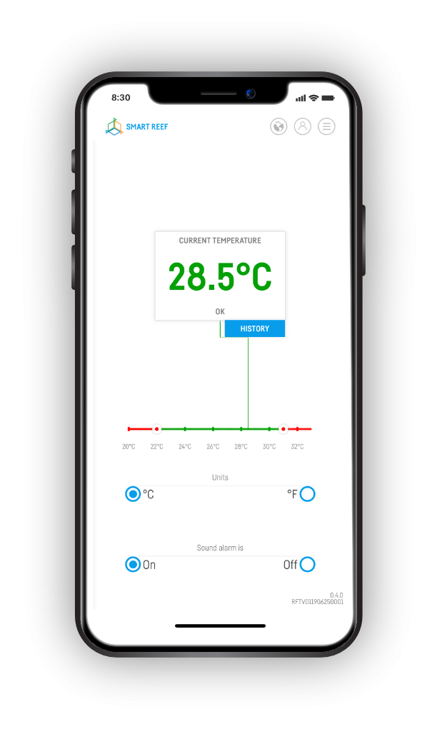 Die Daten können online angezeigt und das Gerät über einen Browser auf einem Laptop oder eine App auf einem Telefon eingerichtet werden. Die Temperatur wird übersichtlich angezeigt. Zusätzlich können Sie Ihr Aquarium schützen, indem Sie Benachrichtigungen einrichten, die bei Erreichen bestimmter Temperaturen aktiviert werden. Nachdem das System mit dem Smart Reef-System verbunden ist, können Sie Textnachrichten direkt auf Ihrem Telefon empfangen.