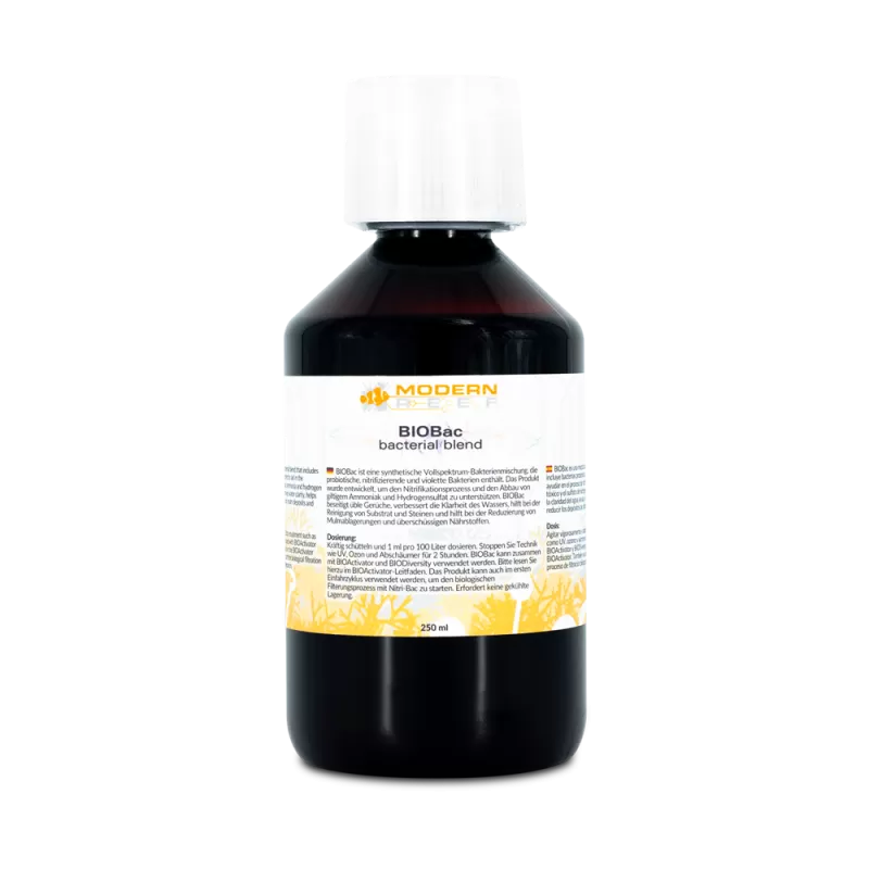 BIOBac Bacterial Blend führt eine Population nützlicher Bakterien in Ihr Aquarium ein, die den Abbau von Abfallprodukten fördern. Diese Bakterien tragen dazu bei, schädliches Ammonium und Nitrit in harmlose Substanzen umzuwandeln, wodurch die Wasserqualität verbessert und das Risiko einer Wasserverschmutzung verringert wird. Dies trägt zu einer gesunden und stabilen Umgebung für Ihre Fische und Korallen bei.