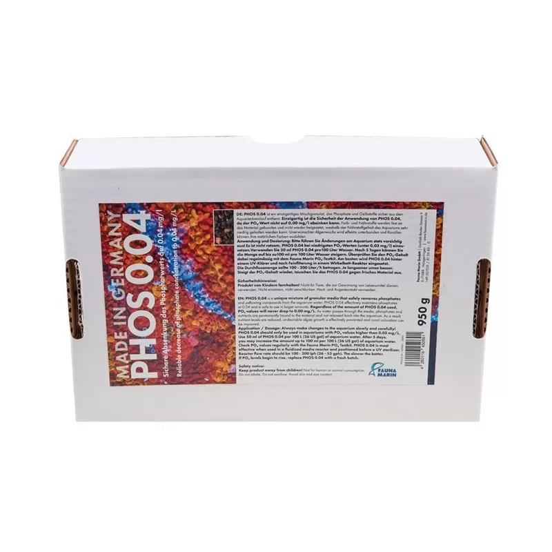 Phos 0,04 ist ein neuartiges Mischgranulat, das Phosphate und Gelbstoffe sicher aus dem Aquarienkreislauf entfernt. Die Sicherheit bei der Verwendung von Phos 0,04 ist einzigartig, da der PO4-Wert nicht unter 0,00 fallen kann. Deshalb ist Phos 0,04 sicher, aber gleichzeitig äußerst effektiv.