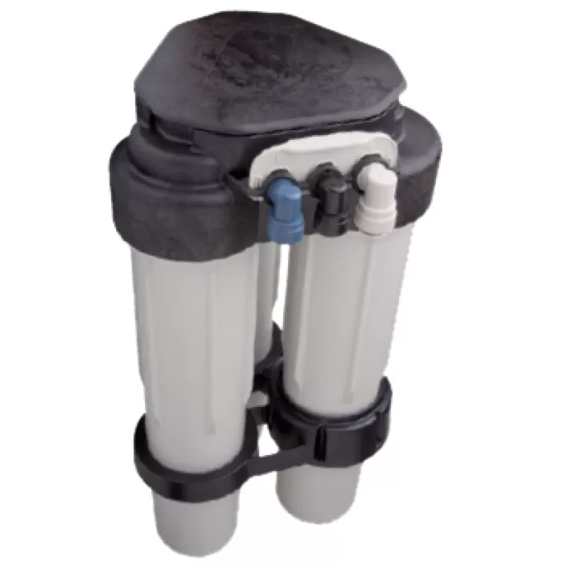 Er arbeitet ohne Druckerhöhungspumpe direkt mit Wasserleitungsdruck (3 - 4 bar). Besteht aus zwei High Flow Membranen und einem Kombivorfilter (Aktivkohle/Feinfilter). Es hat eine Salzrückhaltung von ca. 90 % und ein Abwasser:Reinwasser von 3-4:1.
