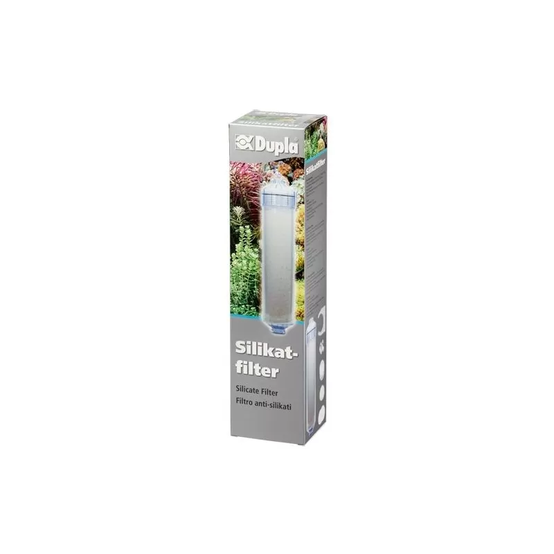 Dupla Silikatfilter Filtergehäuse gefüllt mit 500 ml Duresin SI. Wird hinter einer Osmoseanlage platziert. Inklusive Schlauchanschlüsse für Osmoseanlagen. 500 ml Filtervolumen binden max. 5.000 mg Silikat.
