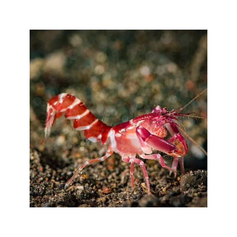 Die Red Pistol Shrimp ist ein sehr beliebtes Tier, da sie sich auch sehr gut für Nano-Aquarien eignet. Der Red Pistol Shrimp wird etwa 6 cm groß und kann mit vielen Grundeln und Gründlingen in Symbiose gehalten werden. Die Garnele hält das Loch sauber und die Grundeln halten Ausschau.