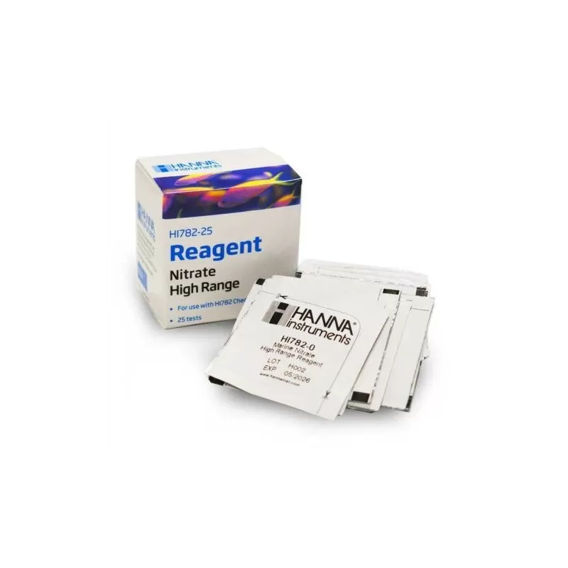 De HI 782-25 zijn hoogwaardige reagentia die vooraf zijn afgemeten, waardoor gebruikers snelle en nauwkeurige metingen kunnen doen met hun Marine Nitrate High Range Checker® HC. Deze reagentia volgen de zinkreductiemethode waarbij de reactie tussen nitraat en het reagens een roze tint in het monster veroorzaakt. Door simpelweg het pakje HI782-25 reagens aan het monster toe te voegen, zal de reactie plaatsvinden en zal de HI782 de concentratie bepalen uit de kleur die wordt geproduceerd. De resultaten worden weergegeven in ppm nitraat (als NO3-). Deze reagentia zijn ontworpen om te worden gebruikt met zoutwatermonsters met een verwacht bereik van 0,0 tot 75,0 ppm.