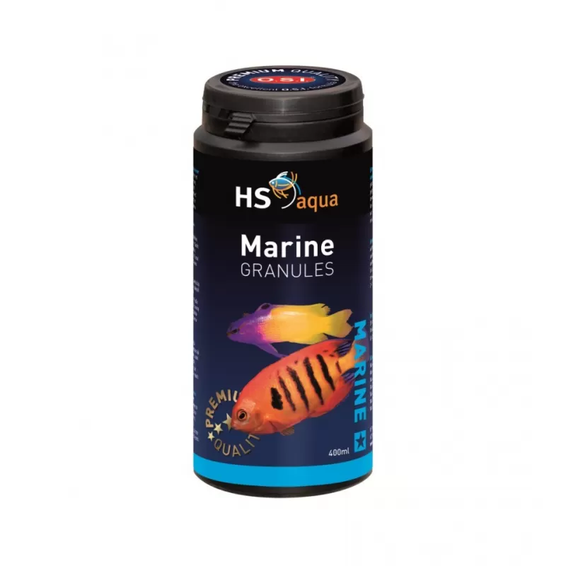 HS Aqua Marine Granules 400 ml is uitgewogen, volledig voer voor alle zoutwater aquariumvissen. Dit voer heeft een hoog gehalte aan licht verteerbare, plantaardige en dierlijke eiwitten en kleurversterkende, natuurlijke pigmenten, waardoor de groei, de gezondheid en de kleur van je vissen bevorderen.