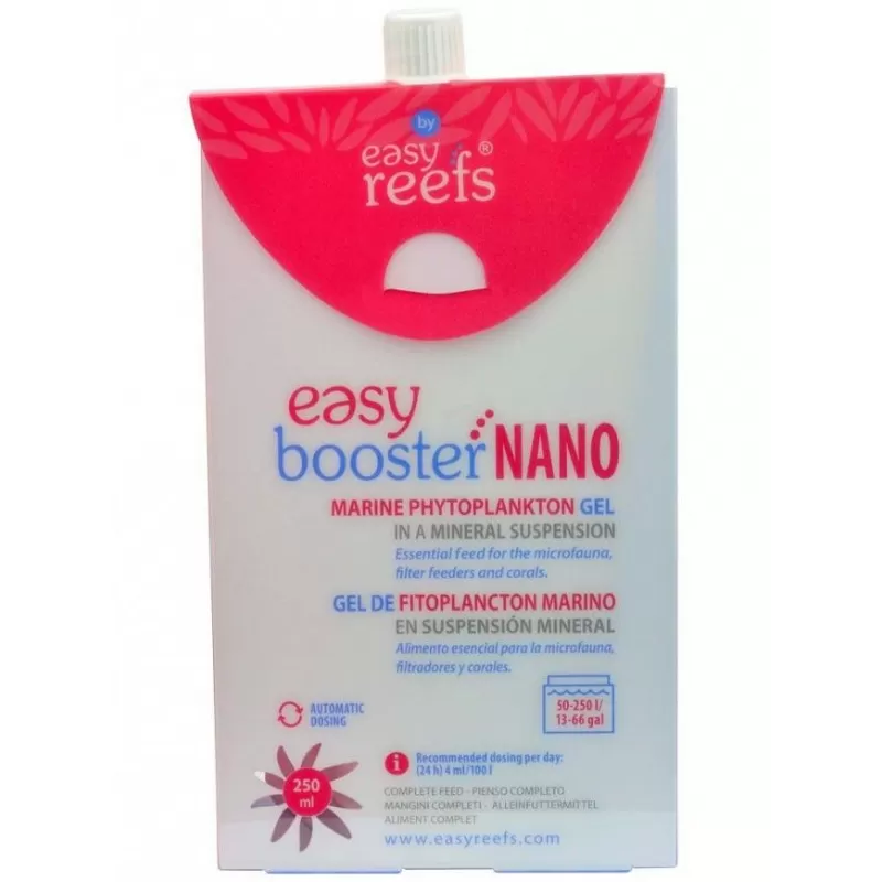 Dit product is vergelijkbaar met Easy Reefs Booster, behalve dat de concentratie zwakker is, waardoor het eenvoudiger wordt om in kleinere aquariums te doseren. In plaats van 1 ml / 150 L te gebruiken, wordt met de Nano versie 4 ml / 100 L gebruikt.