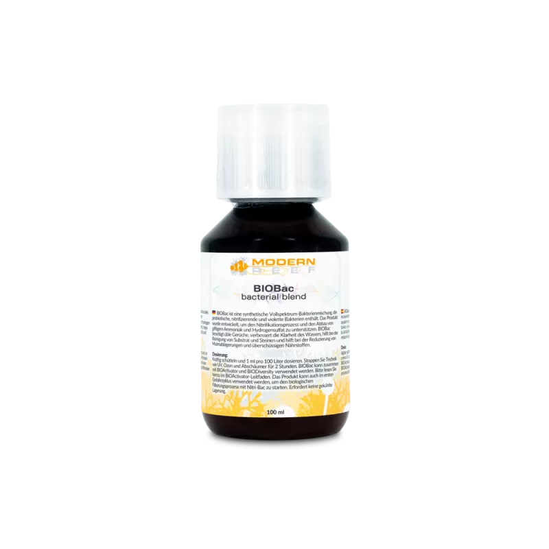 Modern Reef BIOBac Bacterial Blend 100ml is een efficiënte en krachtige mix van nitrificerende bacteriën die de biologische filtratie in je aquarium aanzienlijk verbeteren. Dit product is speciaal ontwikkeld om het afbreken van ammonium en nitriet te versnellen, wat cruciaal is voor het handhaven van een gezonde waterkwaliteit in je aquarium. Dankzij de zorgvuldig geselecteerde bacteriën zorgt BIOBac voor een stabiele en schone omgeving voor je vissen en koralen.