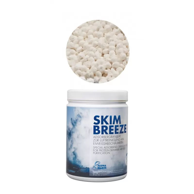Fauna Marin Skim Breeze Special is een speciaal ontwikkelde adsorberende korrel die wordt gebruikt om de lucht die uw eiwitafschuimer aanzuigt te zuiveren. Door deze luchtzuivering worden verschillende voordelen voor uw aquarium bereikt: