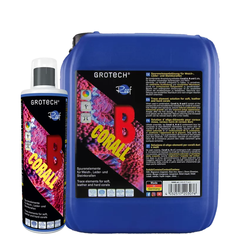 Corall A, B en C zijn 3 combinaties van sporenelementen die apart gedoseerd moeten worden, en die aan alle behoeften van uw lagere dieren tegemoetkomen. De samenstelling van Corall A,B en C werd zo geoptimaliseerd dat bij gecombineerde toediening van Corall A, B en C zowel bij zachte-, leder- en steenkoralen fantastische groei en kleuring bereikt worden. Corall B bevat Magnesium, IJzer, Chroom, Mangaan, Nikkel, Kobalt, Koper … Inhoud 500ml. Dosering max. 10 ml / 100 l aquariumwater per week.