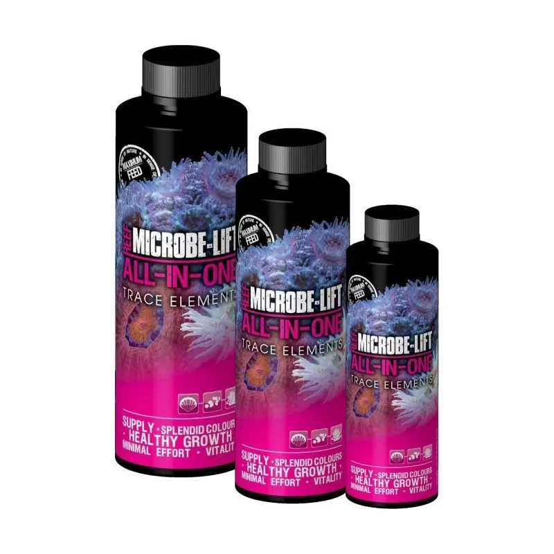 Premium sporenelementen Speciaal ontwikkelde Premium sporenelementen in een fles voor gebruik in zeewateraquaria. Door een nieuw ontwikkeld recept is het nu mogelijk om het houden van een zoutwater aquarium aanzienlijk te vereenvoudigen. All-in-One van Microbe-Lift is een tijdsbesparend product, eenvoudig te doseren en handig in gebruik.