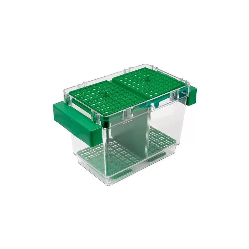 Drijvende kweekhouder die zichzelf aan het waterniveau aanpast. Ook geschikt als opkweekbak. Met scheidingswand voor de plaatsing van twee vissen.