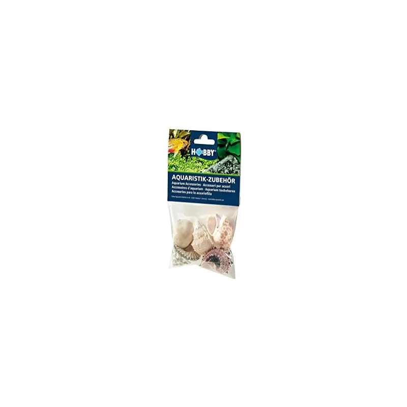 Zakje met 5 schelpen, geschikt om te gebruiken voor heremietkreeftjes.