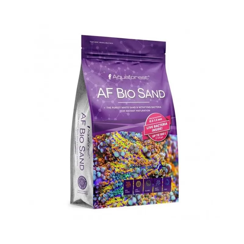 Het is vrij van verontreinigingen en het calciumcarbonaat gehalte helpt de waterchemie te stabiliseren. De nieuwste technologie in AF Bio Sand versnelt het rijpings proces van een aquarium aanzienlijk en zorgt voor een snellere toevoeging van levende have in een nieuw opgezet aquarium.