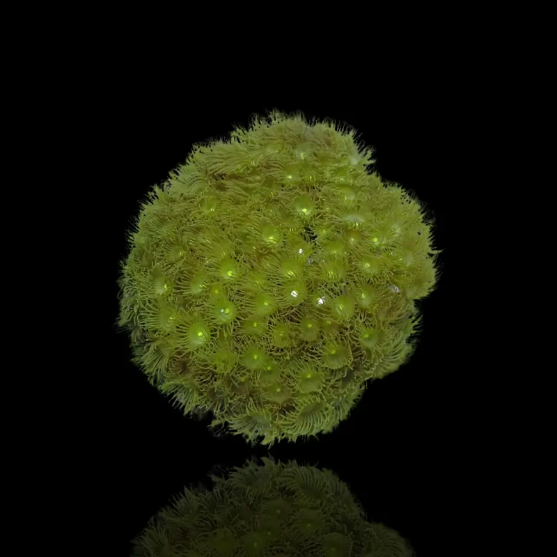 De Gele Kolonie Poliep Koralen zijn koloniale dieren met verschillende individuele poliepen die vastzitten aan een stuk levend gesteente of koraalbrokken. Ze zijn heldergeel van kleur en hun poliepen hebben het vermogen om andere poliepen of koralen te steken. Hoewel de steek niet sterk is, zijn ze semi-agressief en hebben ze ruimte nodig tussen hun kolonie en eventuele buren.