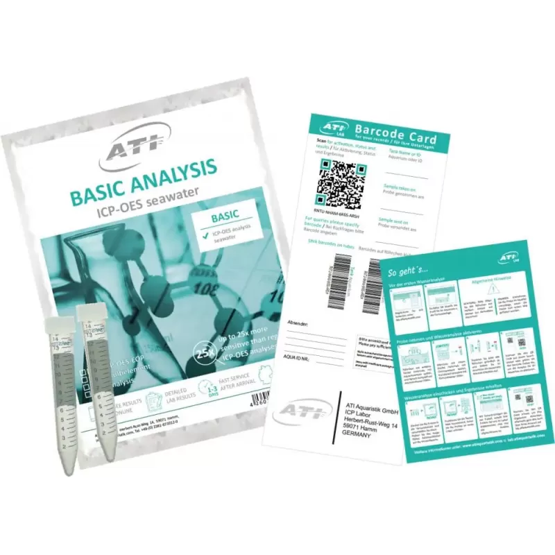 ATI ICP-OES Basic Water Analysis biedt een betrouwbare en nauwkeurige basisanalyse van je aquariumwater. Deze test controleert essentiële macro- en sporenelementen om de waterkwaliteit te bewaken en helpt bij het handhaven van een gezond zeeaquarium.