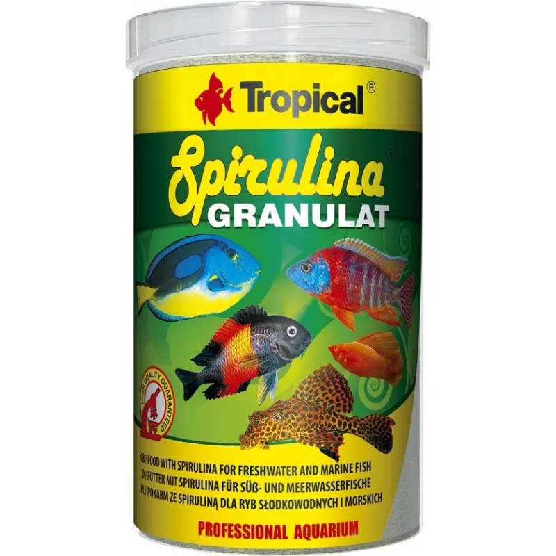 Tropische Spirulina Korrels is een voedsel in de vorm van langzaam zinkende korrels met de toevoeging van spirulina (6%) voor de dagelijkse voeding van herbivore en omnivore vissen in zoetwater- en zeetanks. Spirulina platensis is de bron van gemakkelijk assimileerbare eiwitten, vitamines en sporenelementen, die zorgen voor een goede groei, ontwikkeling en een uitstekende conditie. Het is ook rijk aan natuurlijke carotenoïden, die de kleuren intenser maken en een positief effect hebben op vele fysiologische processen, waaronder groeien en fokken. De toevoeging van zeoliet bevordert een gezond spijsverteringsstelsel en de afgifte van gifstoffen uit vislichamen.