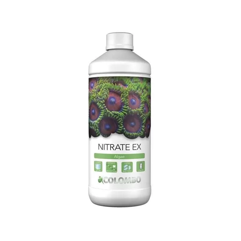 Nitraat is een voedingstof voor algen. Nitrate ex. van Colombo voedt bacteriën in uw aquarium die het nitraat in uw aquarium afbreken. Door Nitrate ex. aan uw aquarium toe te voegen verminderd het nitraatgehalte in uw aquarium en zo dus ook het aantal algen.