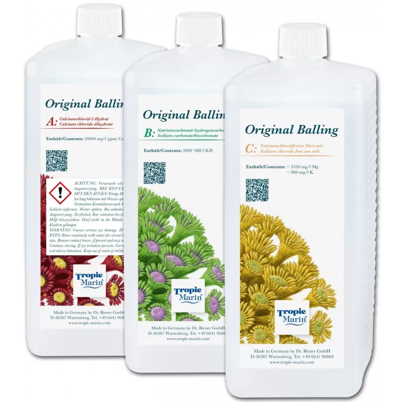 BIO-CALCIUM ORIGINEEL BALLING vloeistofset bestaat uit drie zoutoplossingen A, B en C volgens de welbekende Balling-methode. De driedelige methode voegt calciumchloridedihydraat (deel A) en natriumbicarbonaat (deel B) toe, terwijl de toevoeging van natriumchloride-vrij zeezout (deel C) de cruciale ionische balans in het aquariumwater handhaaft. Deze uitgebalanceerde calciumdosis creëert de beste omstandigheden voor een goede groei van koralen en koraalalgen en vermijdt de onvermijdelijke afname van belangrijke elementen gezien in tweedelige methoden.