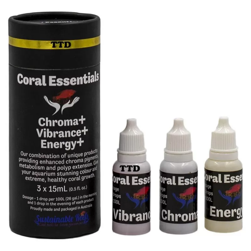 Coral Essentials Chroma+ is een essentiële geconcentreerde blend die chromatische pigmenten verbetert en bevordert. Coral Essentials Energy+ is een essentiële geconcentreerde blend die PE - Poliepverlenging verbetert en bevordert. Coral Essentials Vibrance+ is een essentiële, geconcentreerde mix die de stofwisseling verbetert.