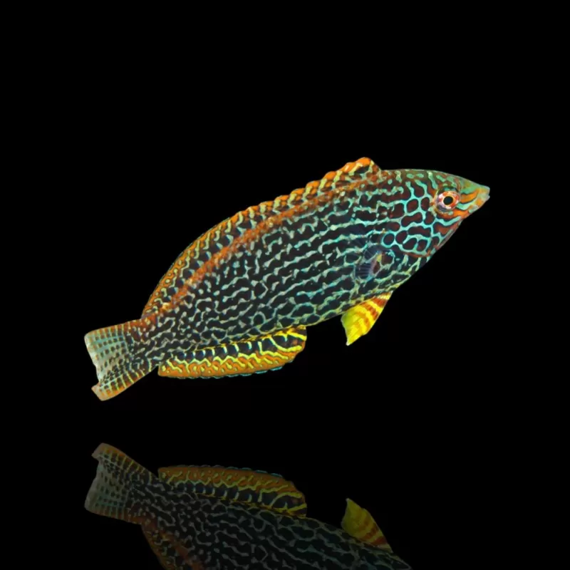 • Kleurenpracht: Deze lipvis heeft een spectaculair kleurenpalet, variërend van blauw en groen tot geel en oranje, met een glinsterend patroon.